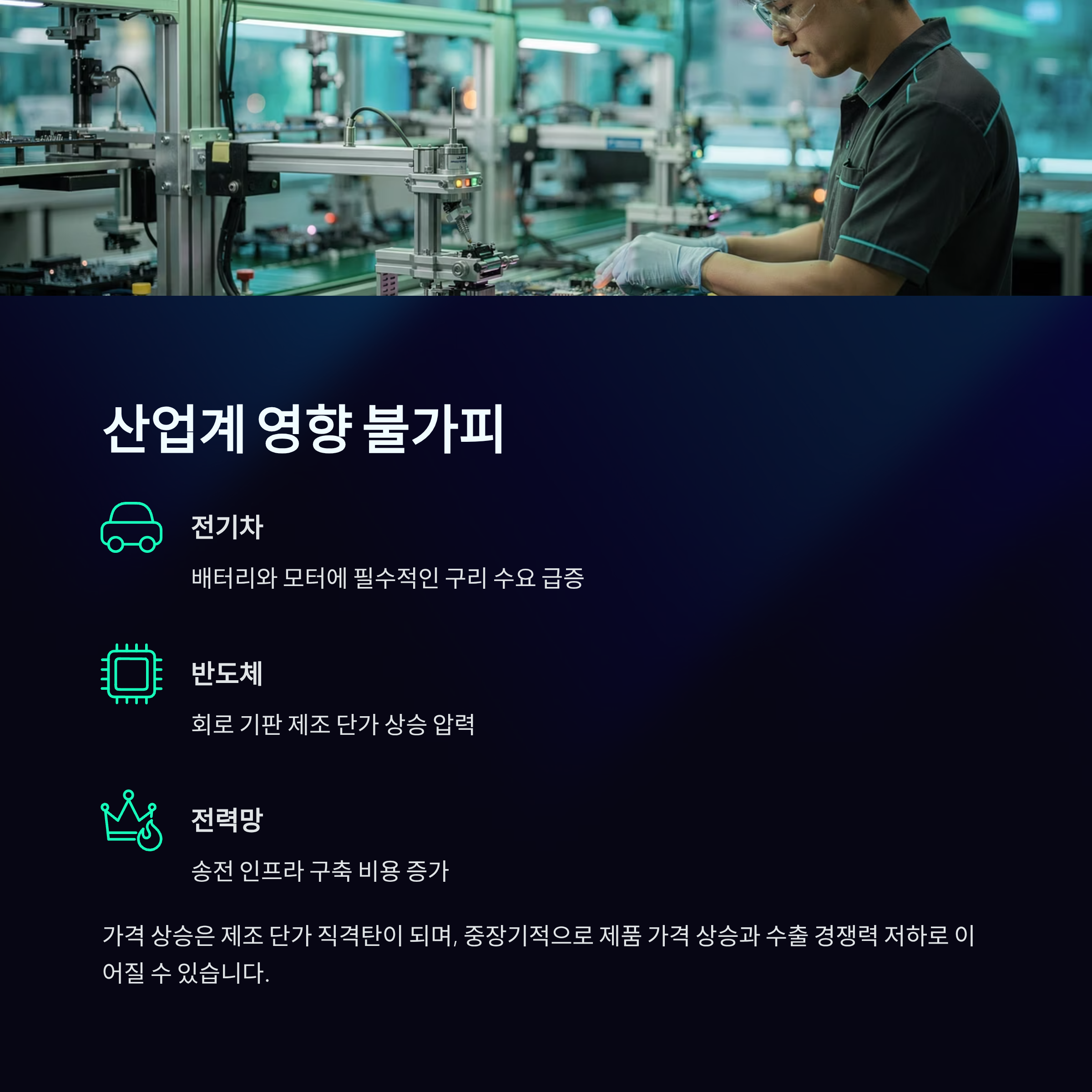 가격 상승은 제조 단가에 직격탄이 되며, 중장기적으로는 제품 가격 상승과 수출 경쟁력 저하로 이어질 수 있습니다.