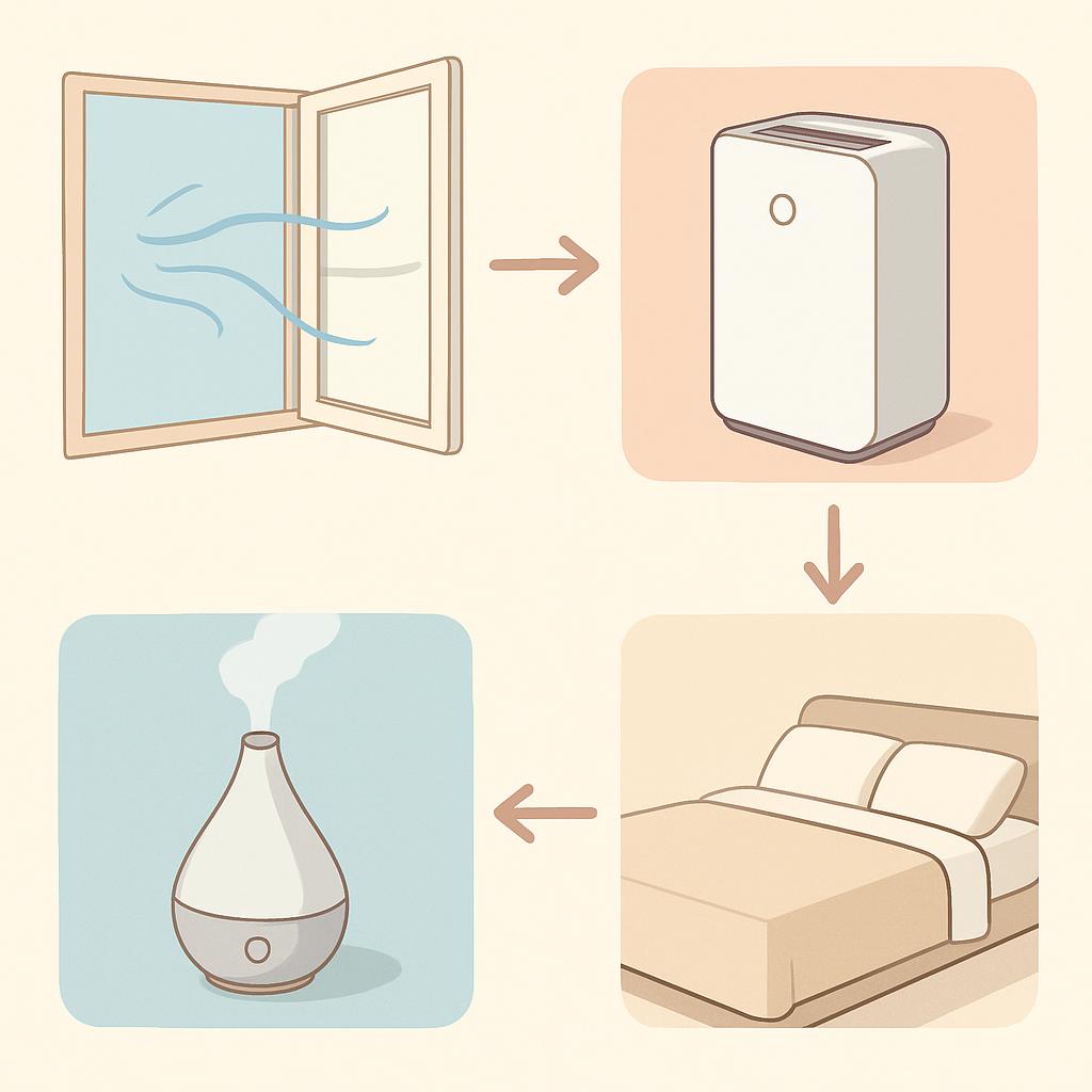 실내 습도는 보통 40~50%를 유지하고 자주 환기를 통해 공기의 흐름을 원활하게 만듭니다. 먼지와 진드기 제거를 위한 주기적 청소와 침구 세탁은 기본이고, 침실 온도는 18~22도 정도를 유지하는 것이 도움이 될 수 있습니다.