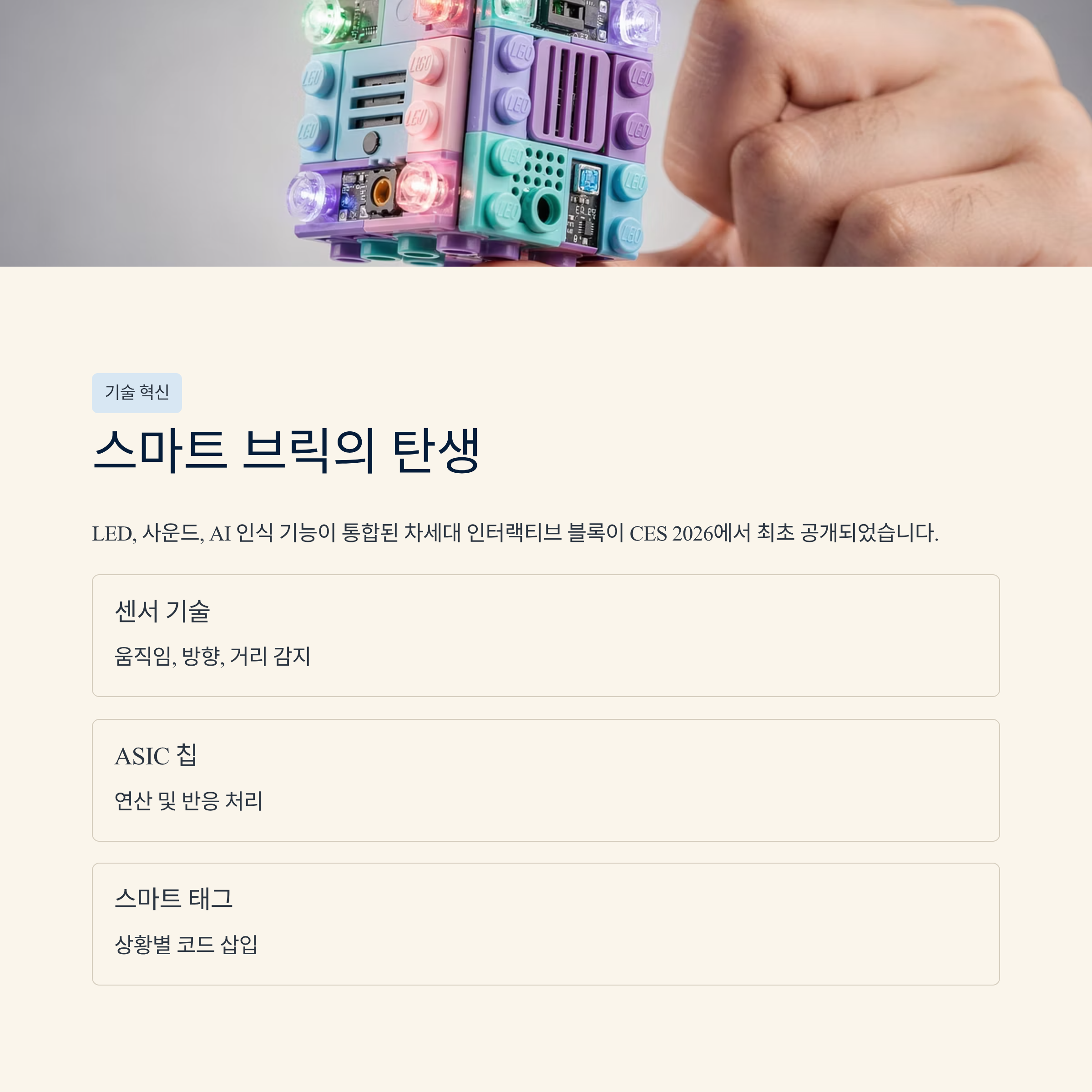 세계 최대 IT 전시회 CES 2026에서 전통 장난감 브랜드 레고가 화려한 기술 기업으로 변신했습니다. LED, 사운드, AI 인식 기능이 통합된 ‘스마트 브릭’을 최초로 공개하며, 상상 속 블록 놀이가 현실 속 인터랙티브 테크놀로지로 진화하고 있다는 강한 메시지를 던졌습니다.