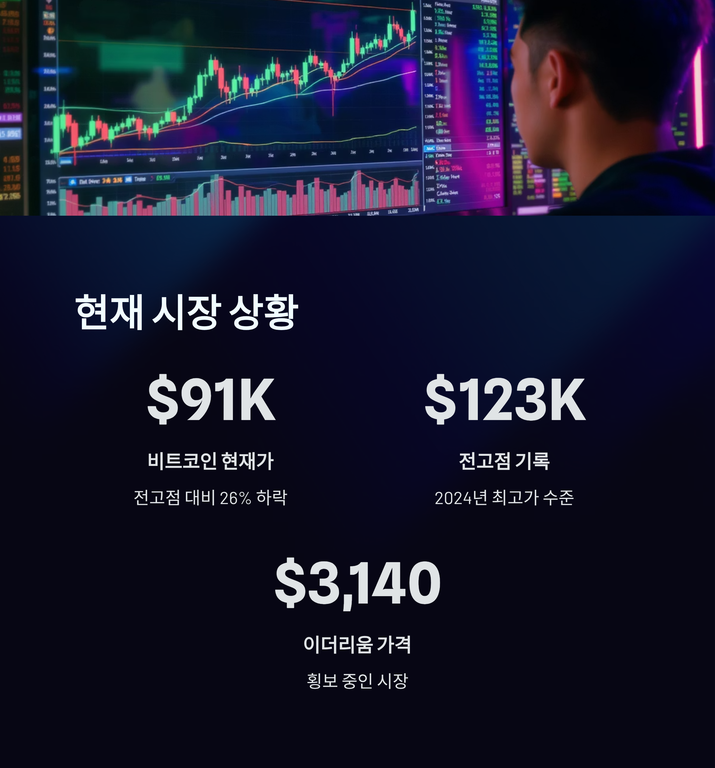 1월 초 기준, 비트코인은 약 9만1330달러선에서 거래되고 있으며, 이는 전고점이었던 12만3100달러 대비 약 26% 하락한 수치입니다. 이더리움 역시 3140달러선에서 횡보 중으로, 전반적인 시장의 힘은 약세 국면에 머물고 있습니다.