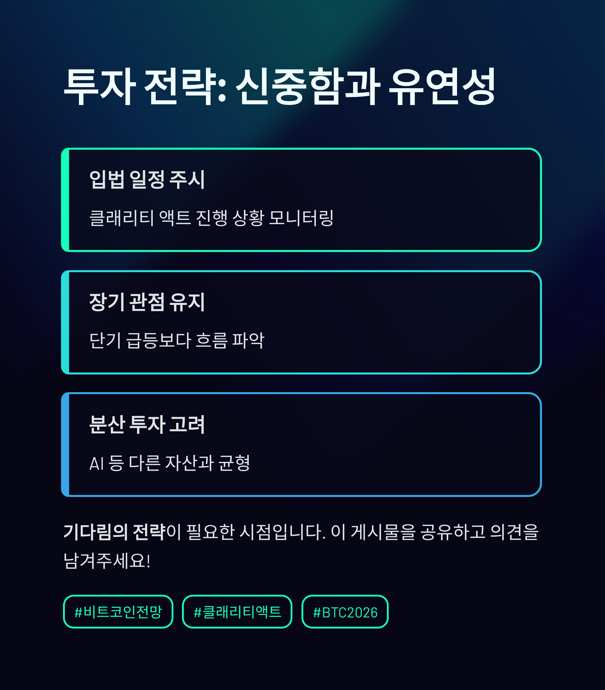 이처럼 예측이 엇갈리는 가운데, 투자자 입장에서는 입법 일정과 글로벌 금리, 기술 트렌드 등을 종합적으로 고려한 유연한 대응이 요구됩니다. 단기 급등보다는 장기적 흐름을 지켜보는 ‘기다림의 전략’이 필요한 시점입니다.