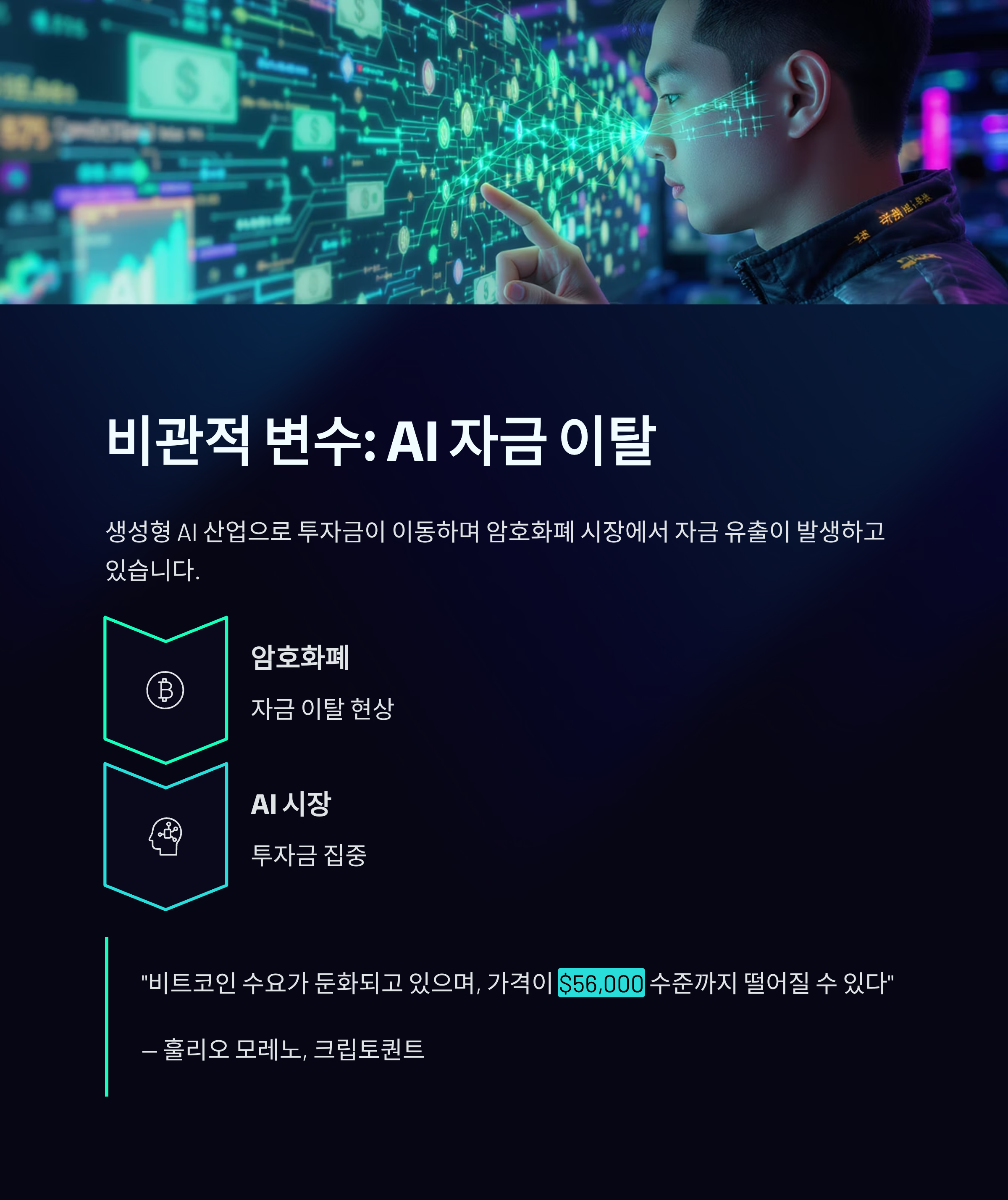 최근 AI 시장으로의 자금 이동도 비트코인에 부정적인 변수로 작용하고 있습니다. 특히 고성장하는 생성형 AI 산업에 투자금이 몰리면서 암호화폐 시장에서 자금 이탈 현상이 나타나고 있습니다. 크립토퀀트의 훌리오 모레노는 “비트코인 수요가 둔화되고 있으며, 가격이 5만6000달러 수준까지 떨어질 수 있다”고 전망했습니다.
