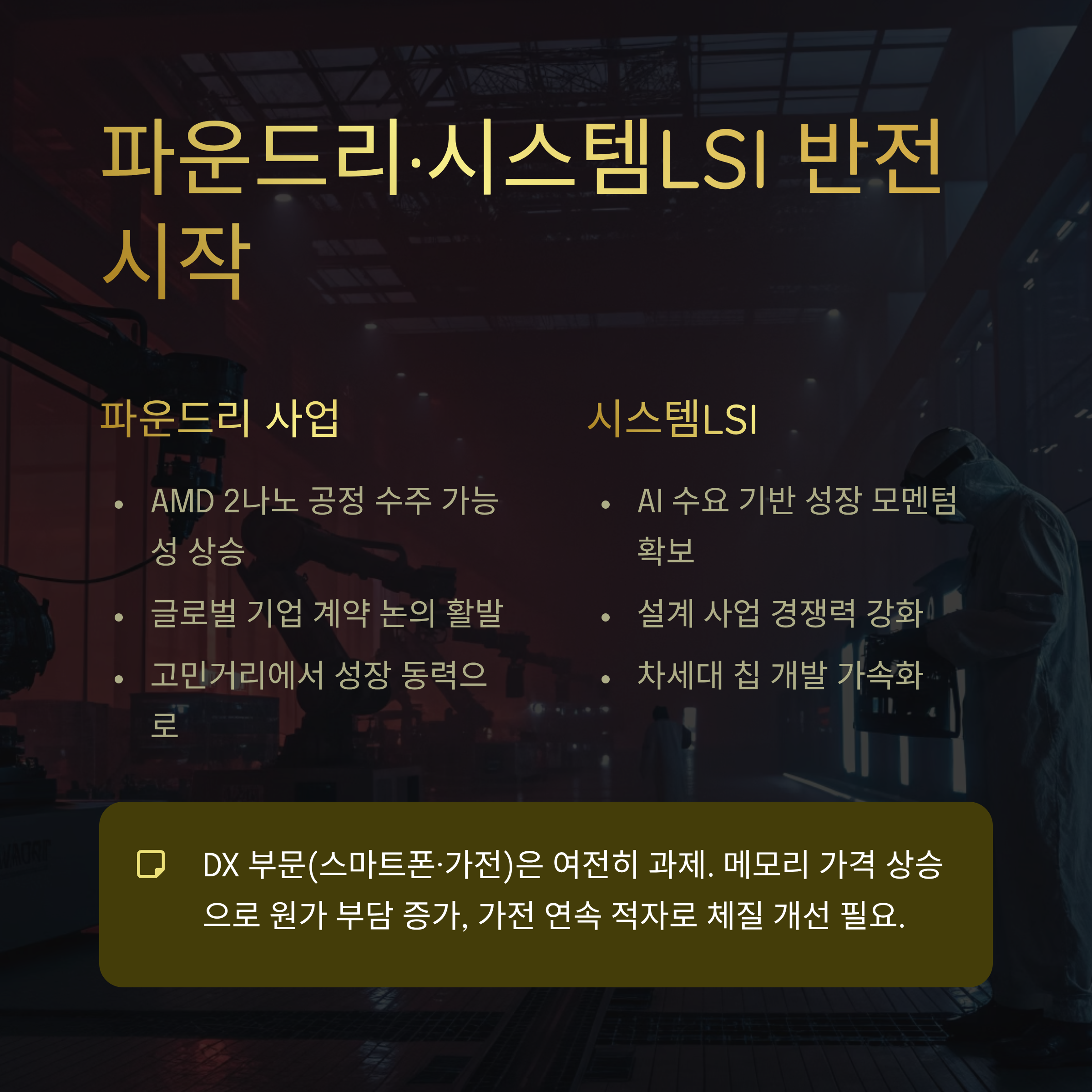 | 파운드리 사업 | 정체 | 2나노 수주 본격화 기대 | AMD 등 글로벌 고객 대상 |