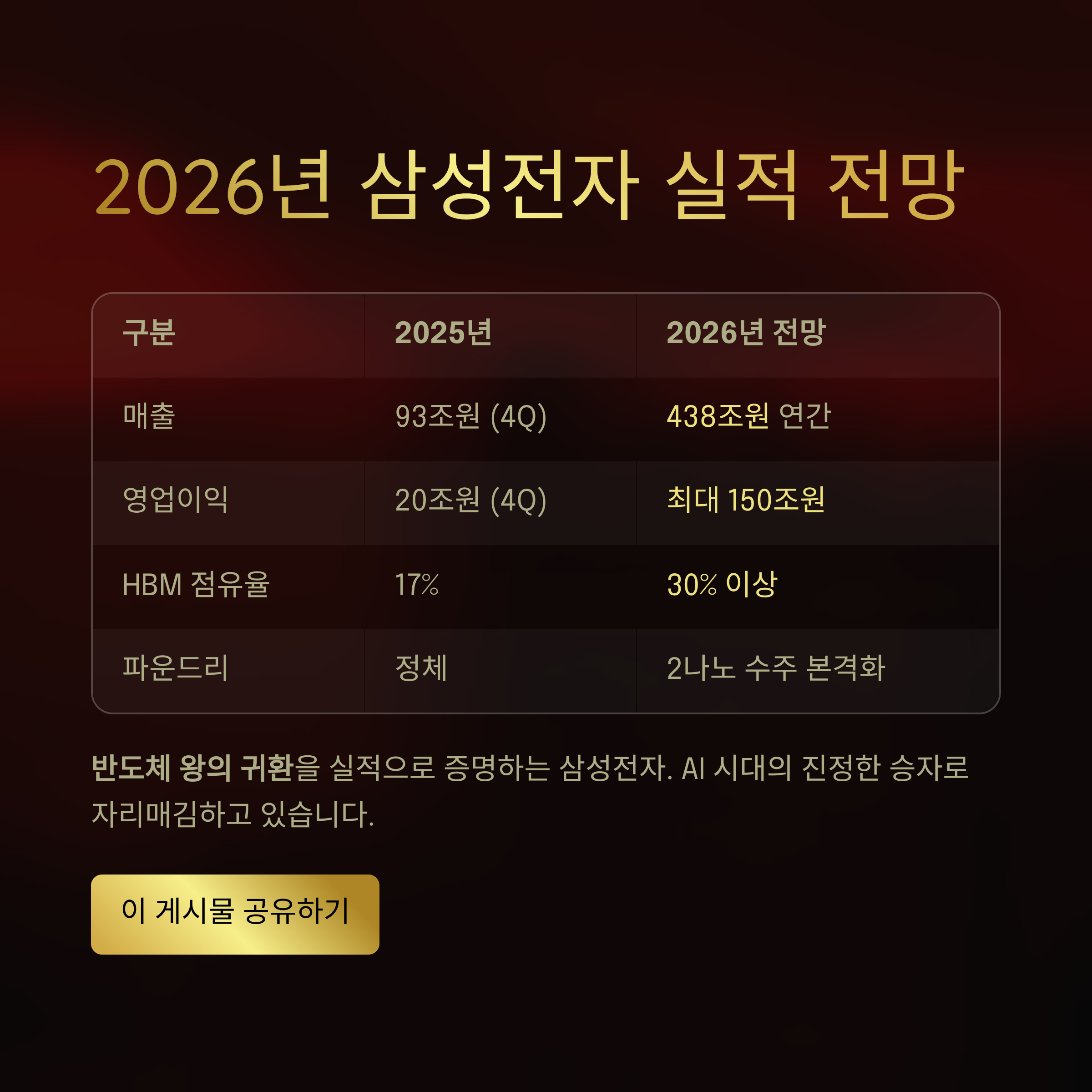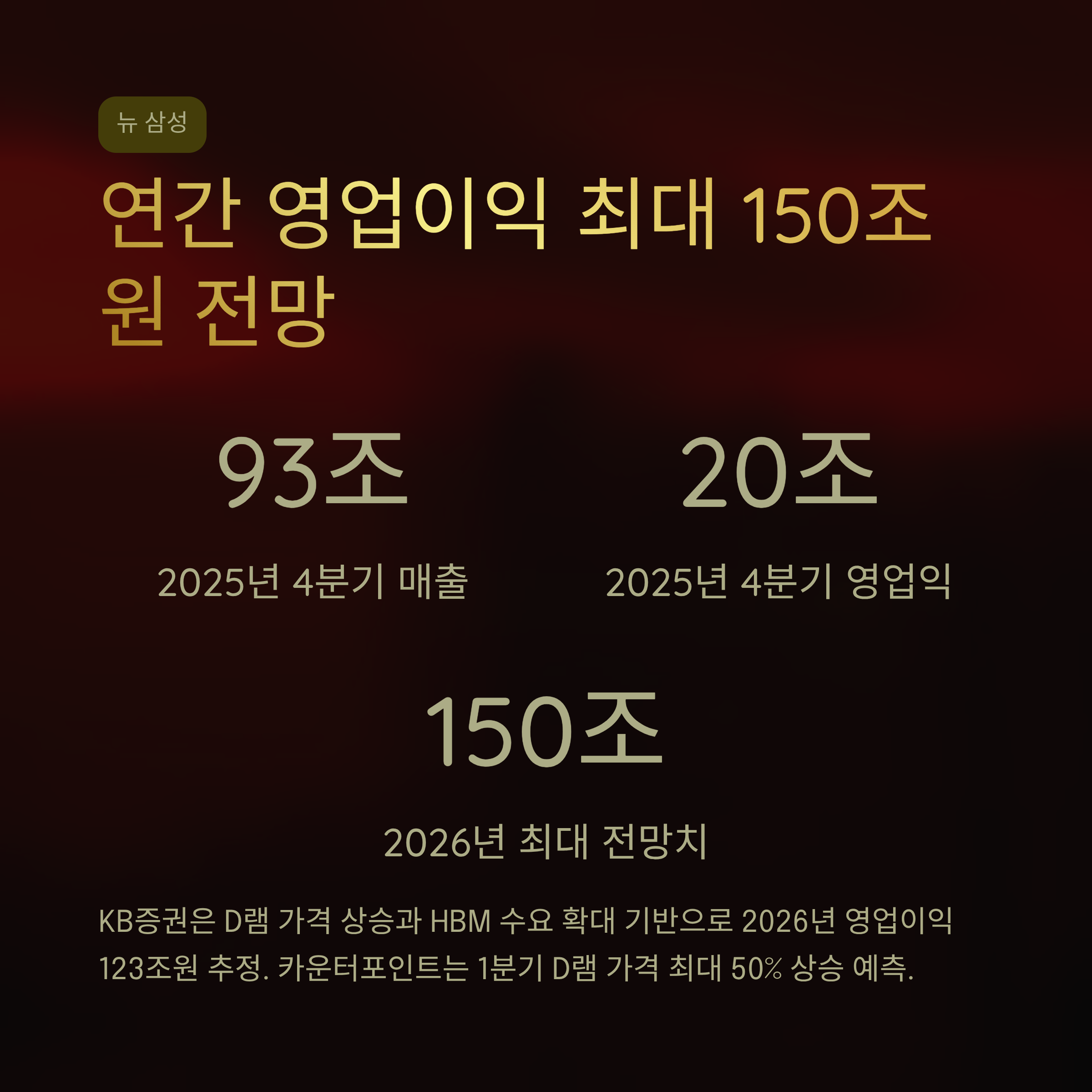 | 영업이익 | 20조원 (4Q 기준) | 최대 150조원까지 전망 | D램·HBM·낸드 수익 확대 영향 |