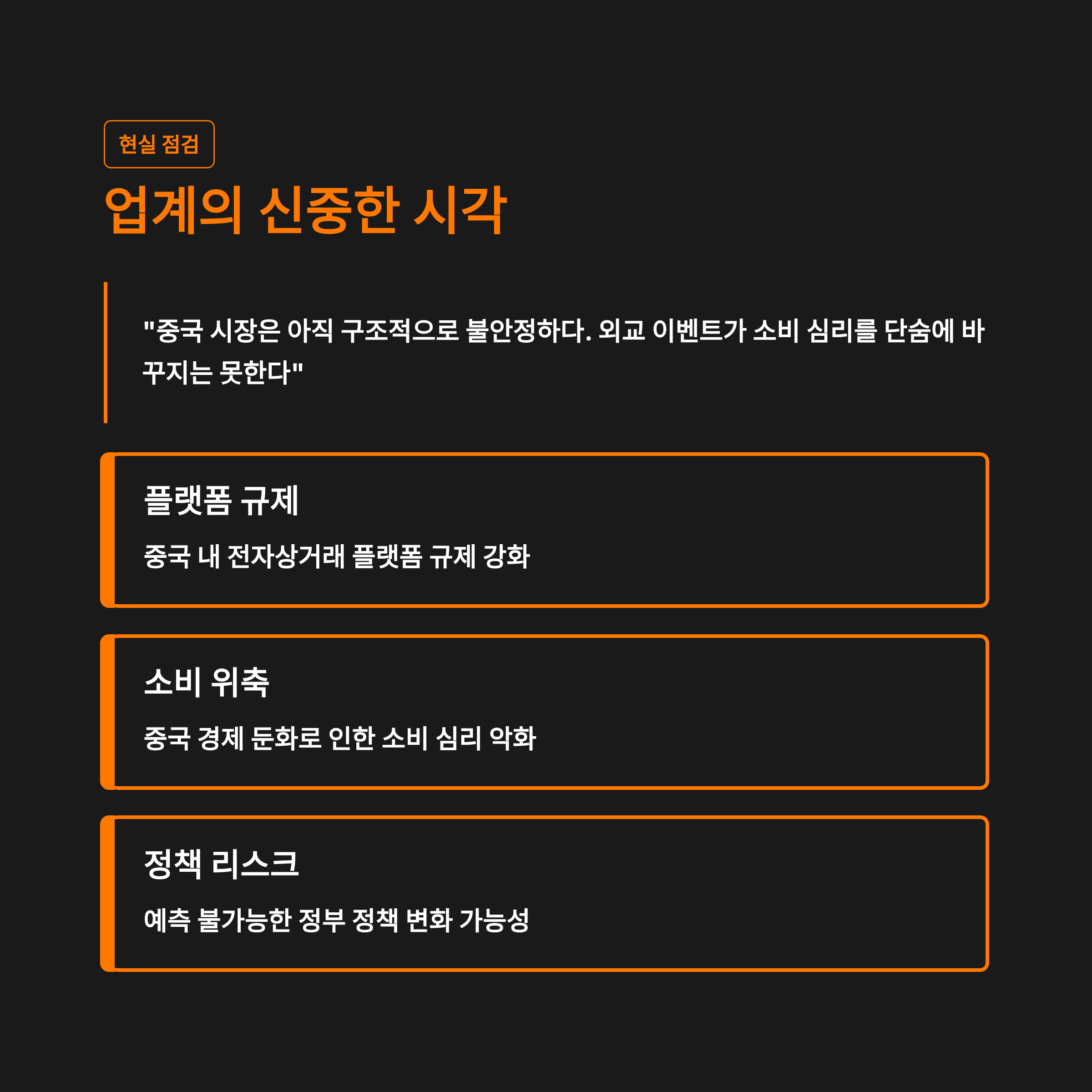 | 업계 우려 | 중국 내 소비 위축, 규제 리스크, 불확실한 정책 환경 |