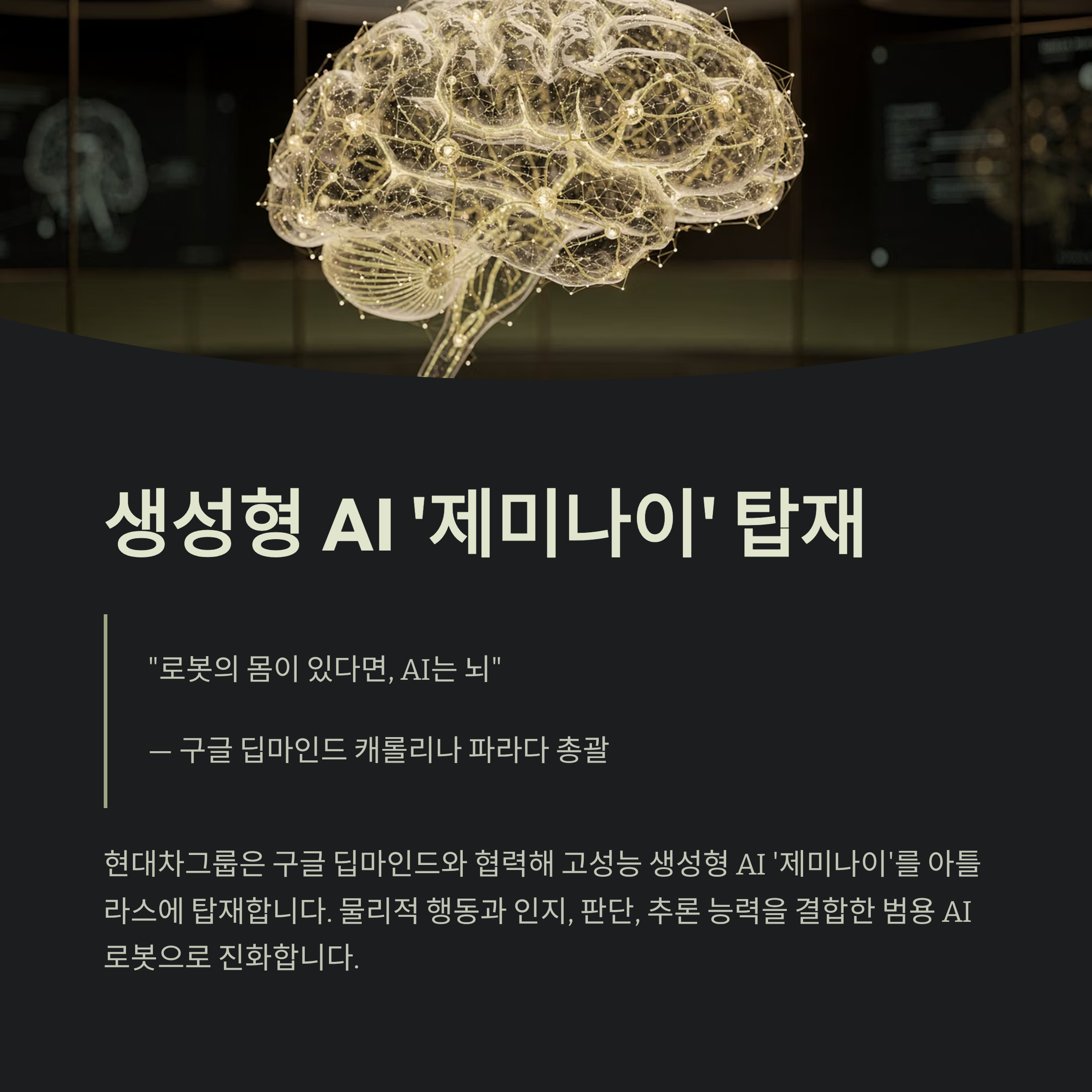 현대차그룹은 구글 딥마인드와 손잡고, 고성능 생성형 AI ‘제미나이’를 아틀라스에 탑재할 계획입니다.