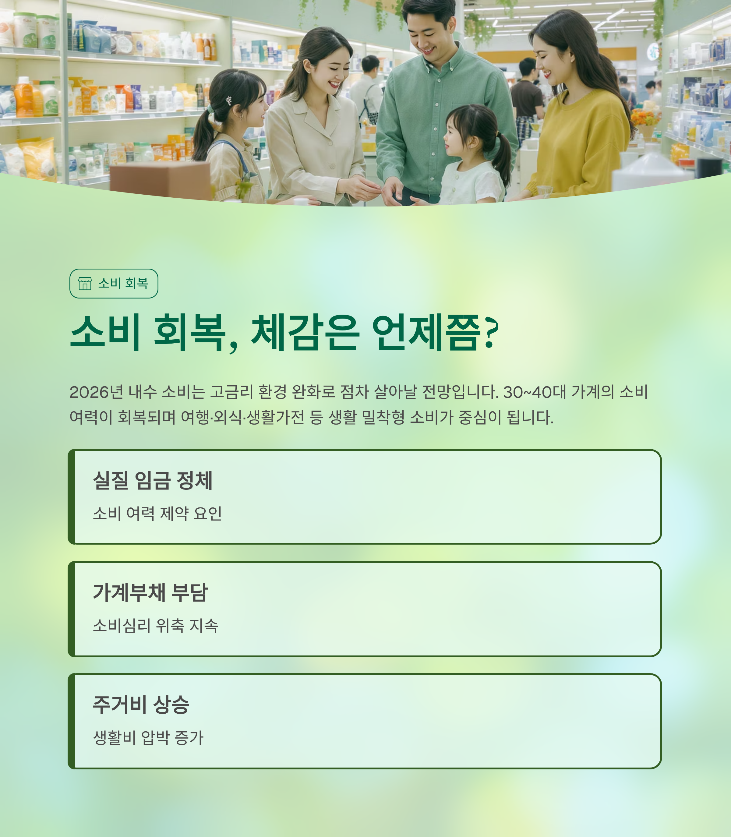 특히 30~40대 가계의 소비 여력이 다소 회복되고 있으며, 여행·외식·생활 가전 등 생활 밀착형 소비가 중심이 되고 있습니다.