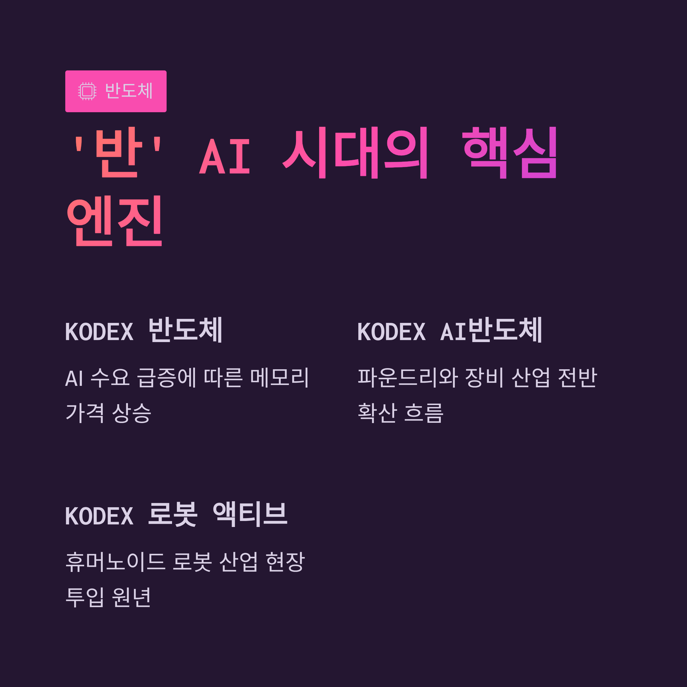 이는 각각 대표지수(대), 반도체·로봇(반), **전력·인프라(전)**를 의미하며, KODEX 시리즈를 중심으로 한 ETF 라인업을 통해 국내 증시 반등 흐름을 포착하자는 전략입니다.