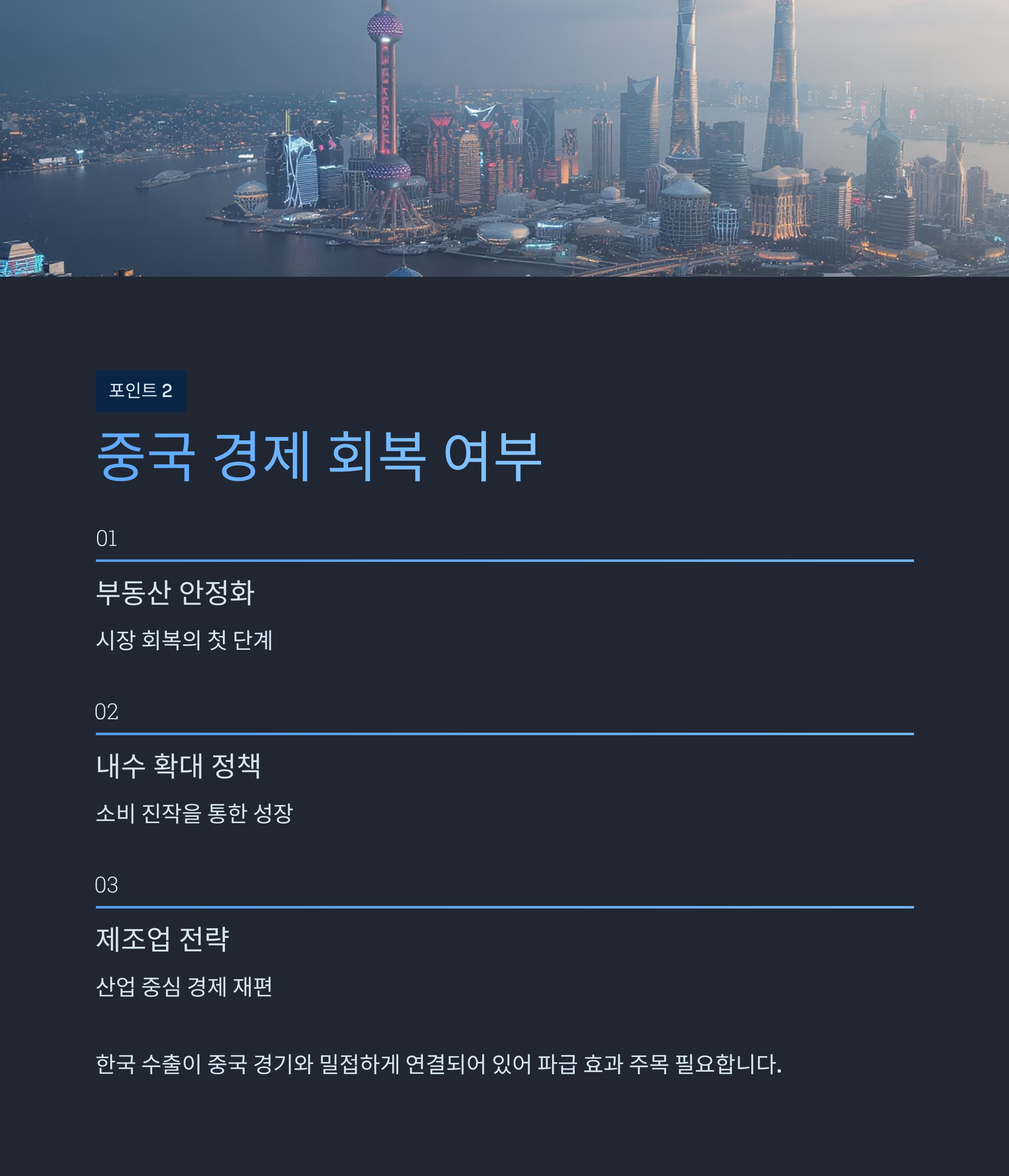 부동산 시장 안정화, 내수 확대 정책, 제조업 중심의 산업 전략 등이 중요한 역할을 할 것으로 보입니다.