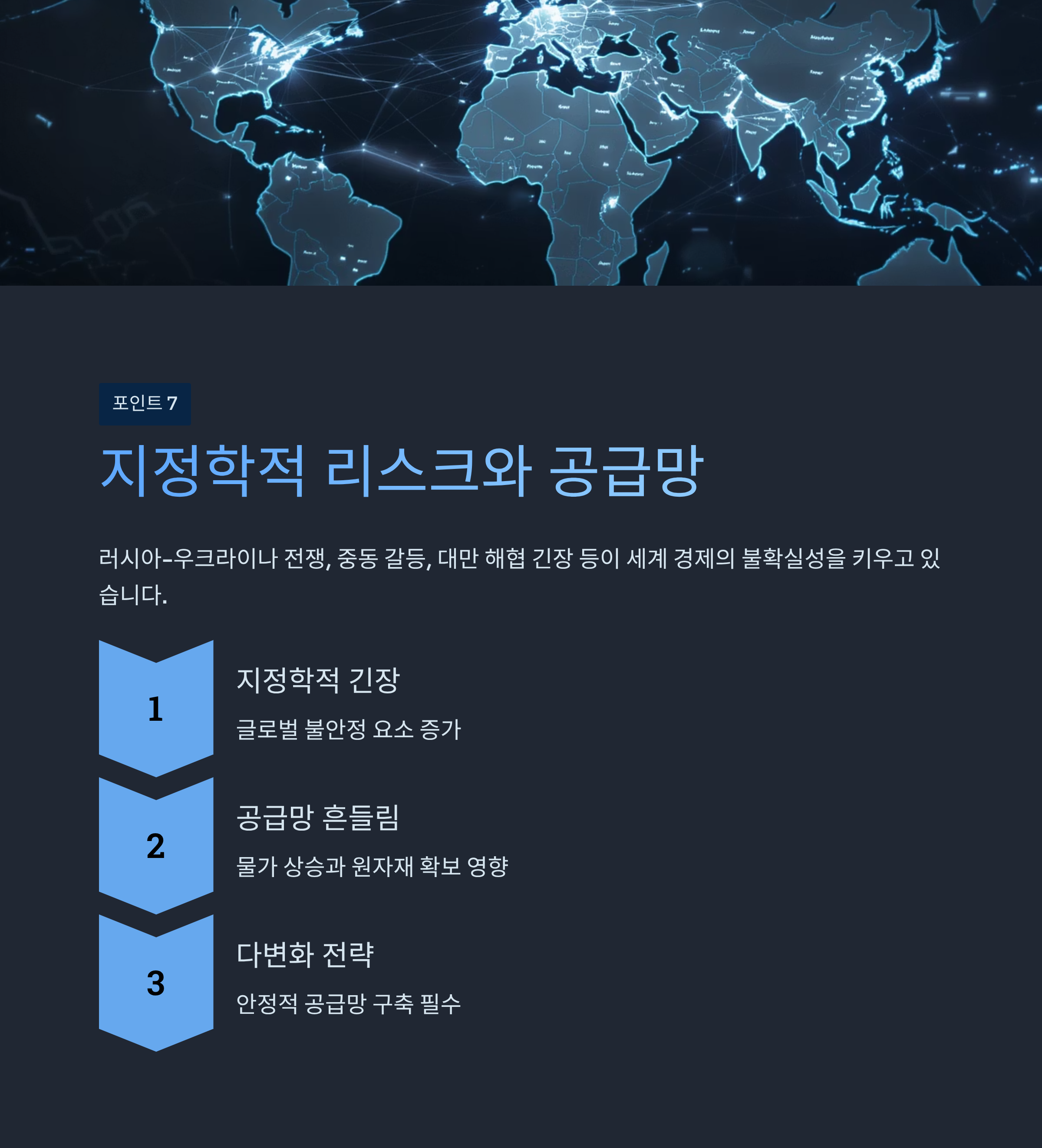 러시아-우크라이나 전쟁, 중동 갈등, 대만 해협 긴장 등 지정학적 불안정 요소는 여전히 세계 경제의 불확실성을 키우고 있습니다.