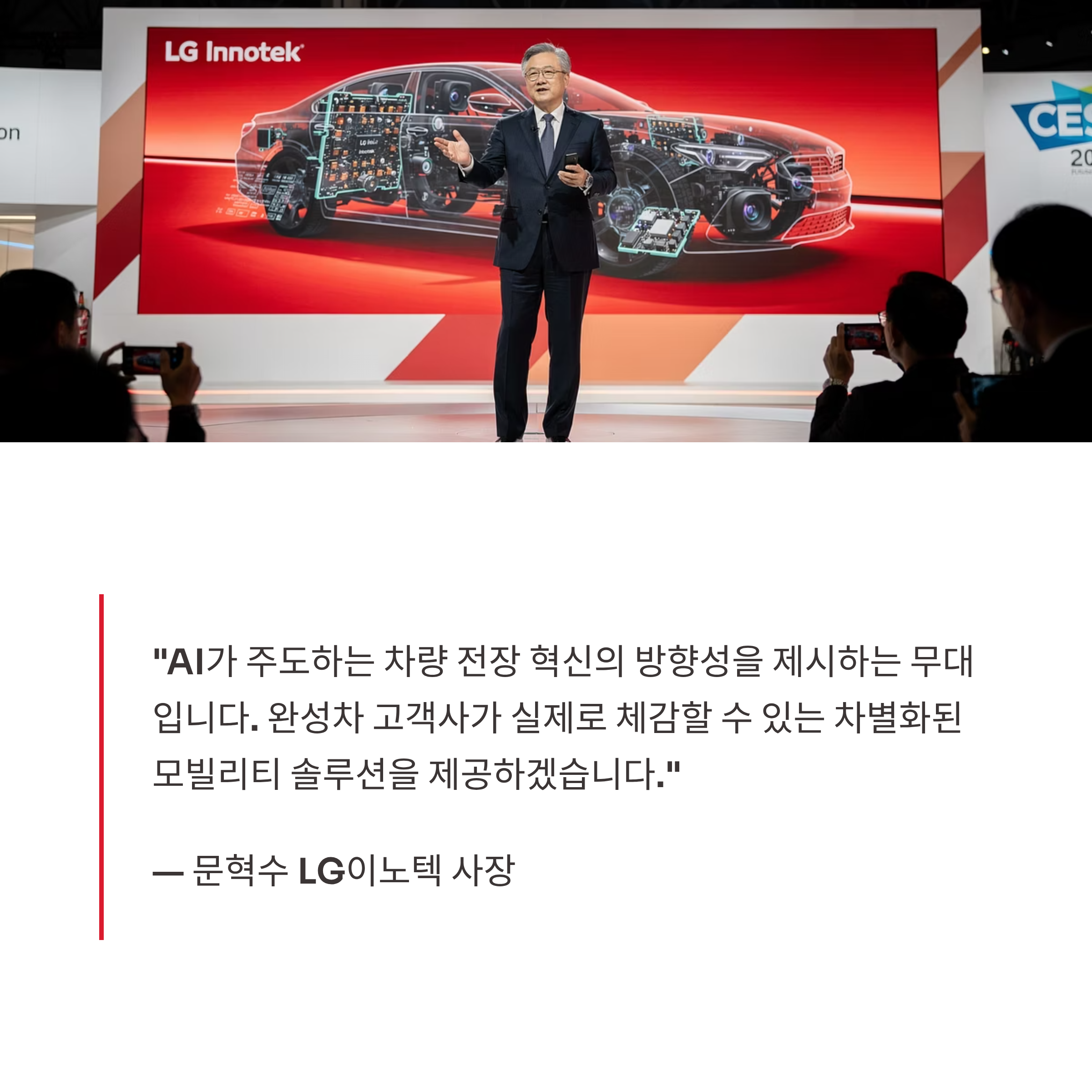 문혁수 LG이노텍 사장은 “이번 CES는 단순한 기술 전시가 아니라, AI가 주도하는 차량 전장 혁신의 방향성을 제시하는 무대”라며 “완성차 고객사가 실제로 체감할 수 있는 차별화된 모빌리티 솔루션을 제공하겠다”고 밝혔습니다.