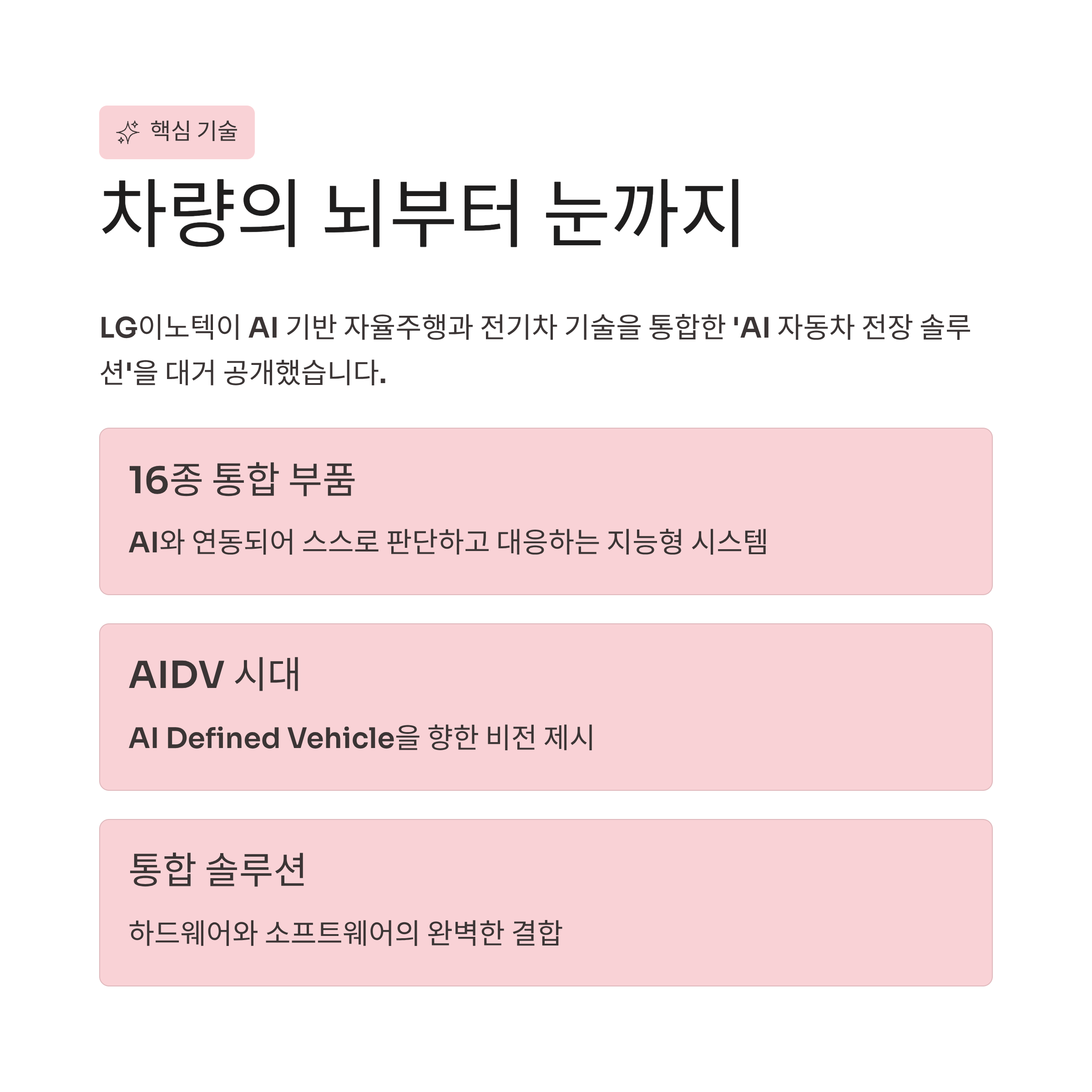 LG이노텍이 CES 2026에서 인공지능 기반의 자율주행과 전기차 기술을 통합한 ‘AI 자동차 전장 솔루션’을 대거 공개했습니다. 단순 부품 제조를 넘어 차량의 지능과 감각을 완성하는 핵심 모듈을 중심으로, AIDV(AI Defined Vehicle) 시대를 향한 비전을 제시하며 미래 모빌리티 산업의 혁신을 주도하겠다는 포부를 밝혔습니다.